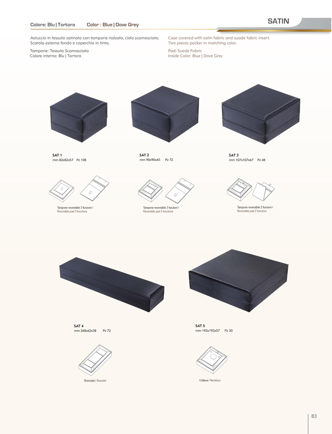 Satin Astuccio in tessuto satinato con tampone rialzato, cielo scamosciato. Scatola esterna, fondo e coperchio in tinta. Tampone: Tessuto Scamosciato Colore Interno: Blu | Tortora PER INFO E PREVENTIVI CONTATTARE IL NUMERO TELEFONICO: 392.0686047