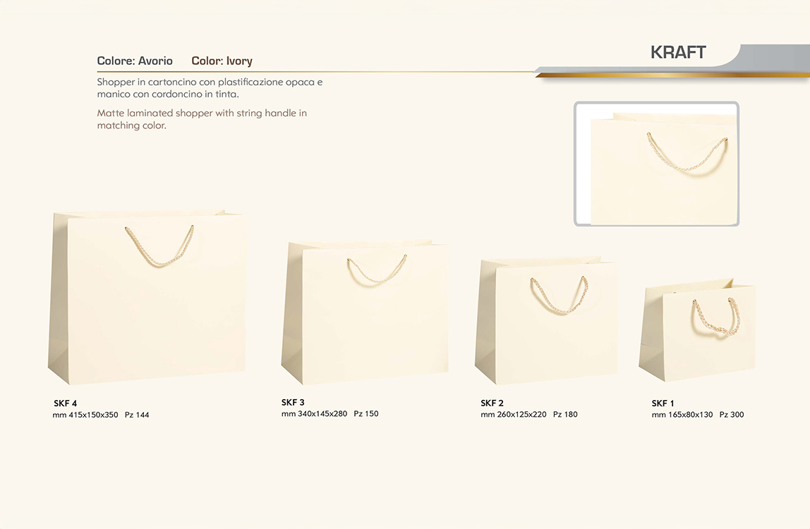 Shopper Kraft Shopper in cartoncino con plastificazione opaca e manico con cordoncino in tinta. PER INFO E PREVENTIVI CONTATTARE IL NUMERO TELEFONICO: 392.0686047