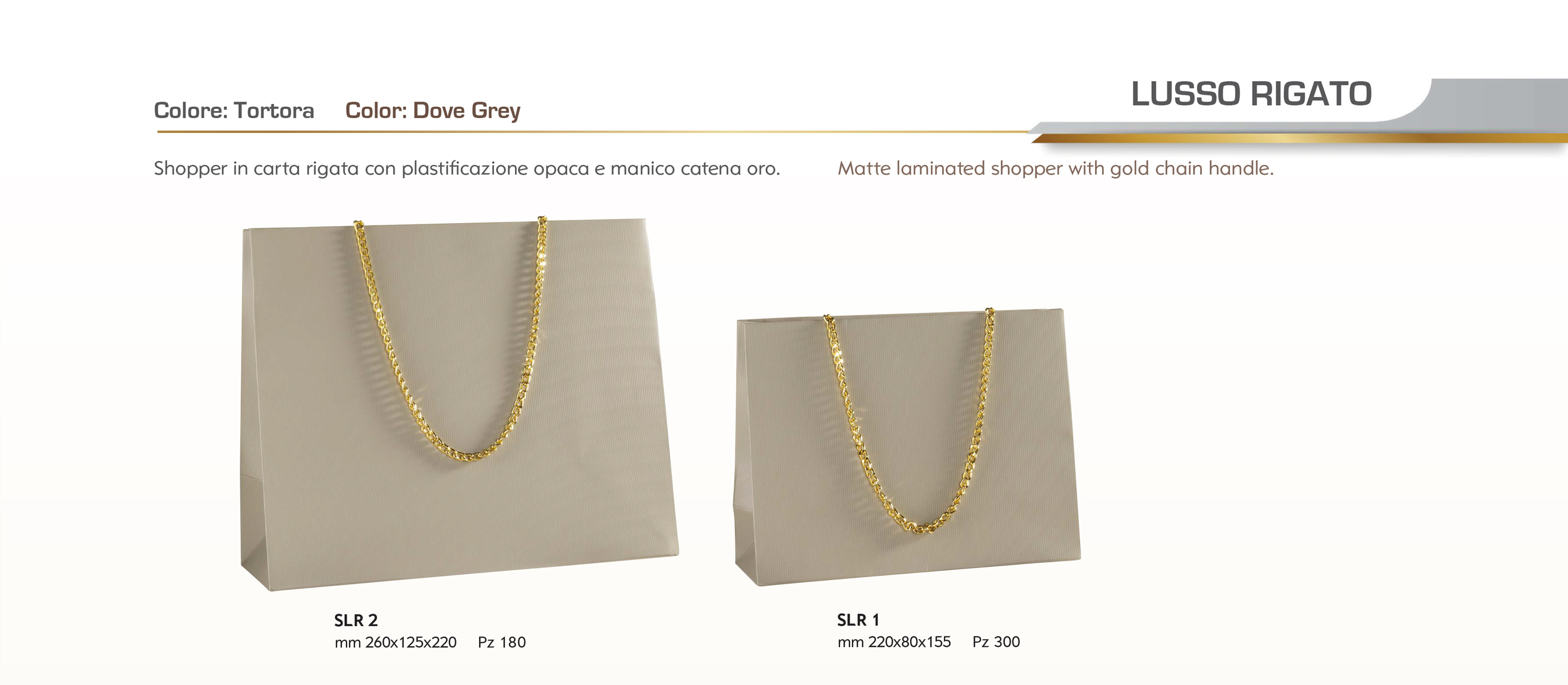 Shopper Lusso Rigato Shopper in carta rigata con plastificazione opaca e manico catena oro. PER INFO E PREVENTIVI CONTATTARE IL NUMERO TELEFONICO: 392.0686047